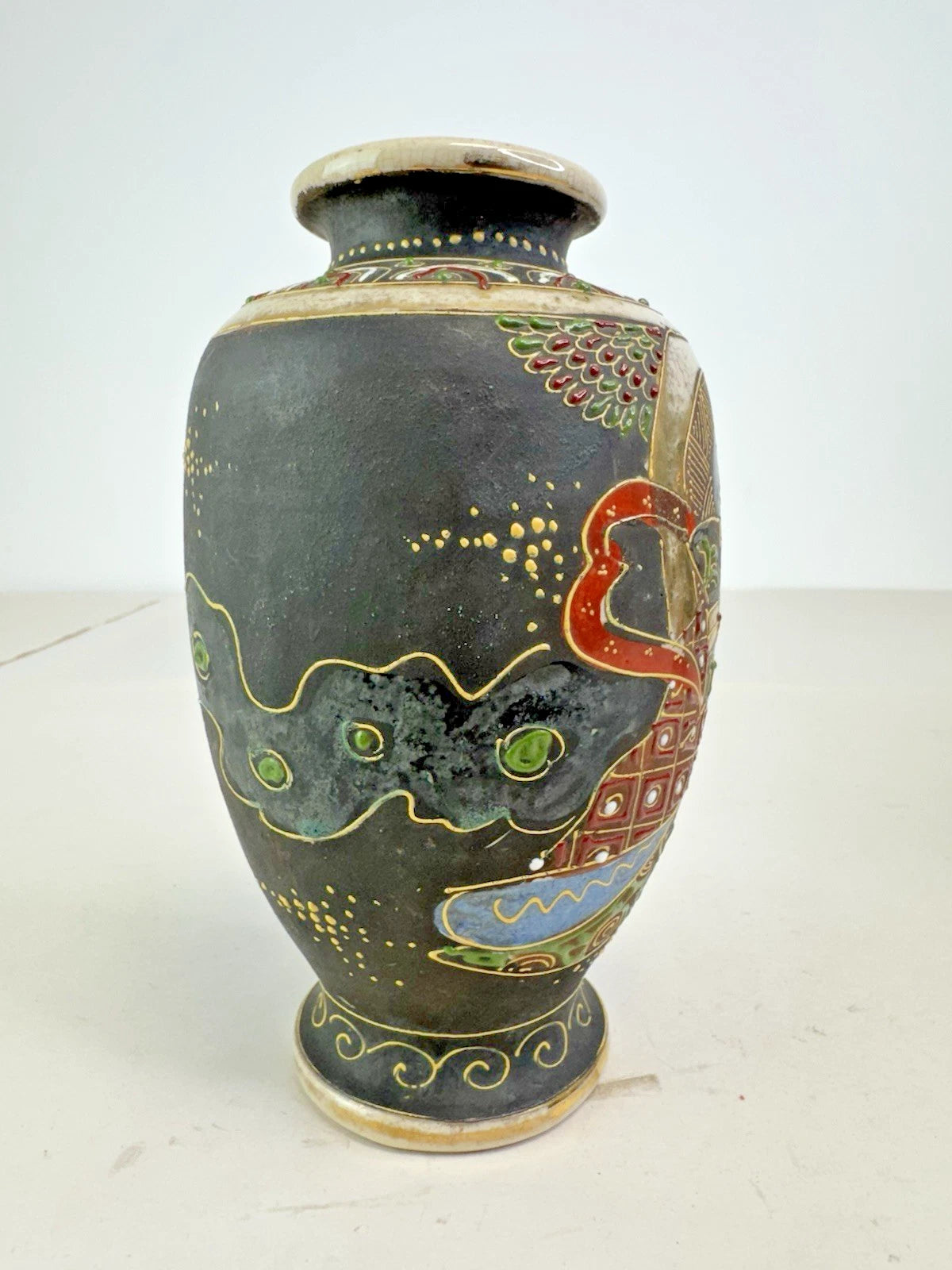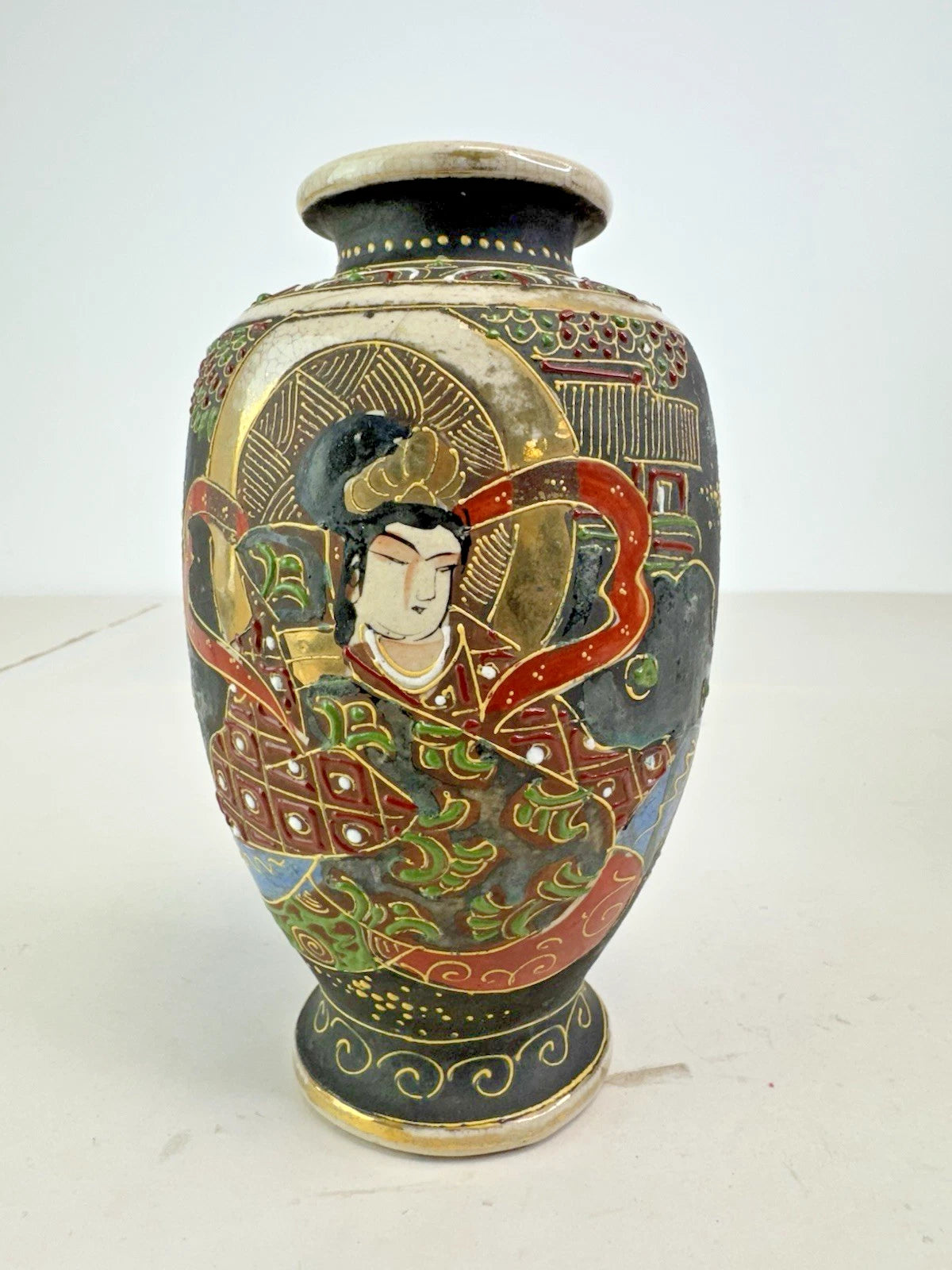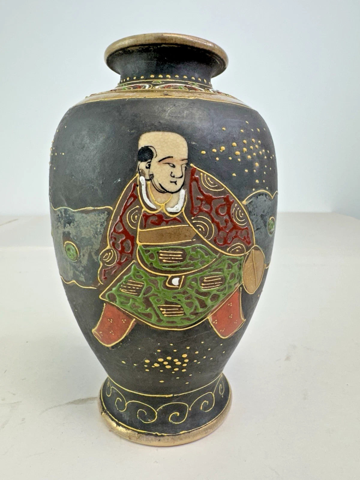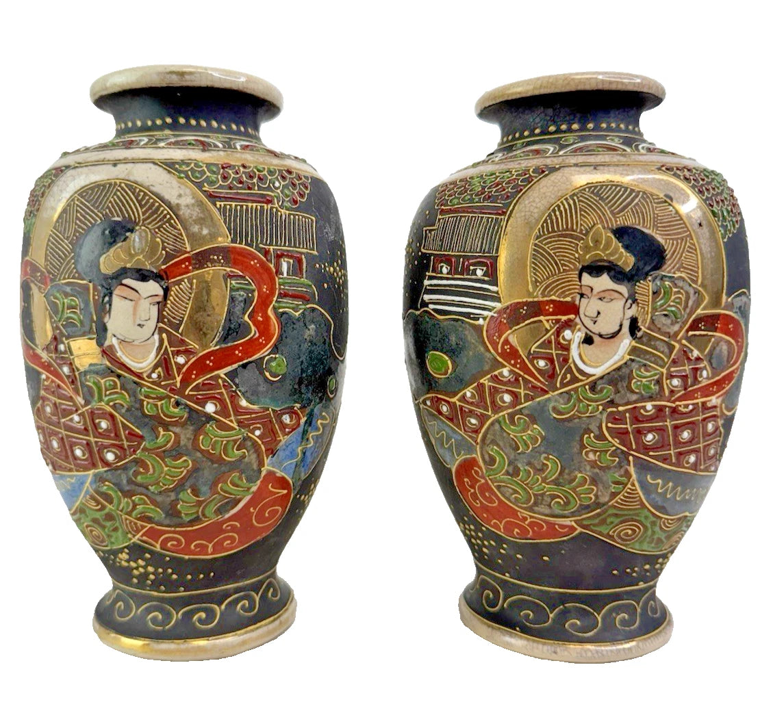 Pair of Antique Japanese Satsuma Moriage Vases Hand-Painted Figural Immortal 7.5" Tall