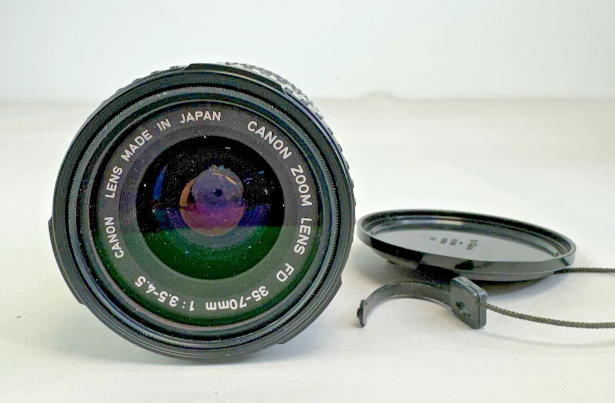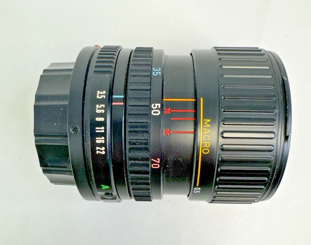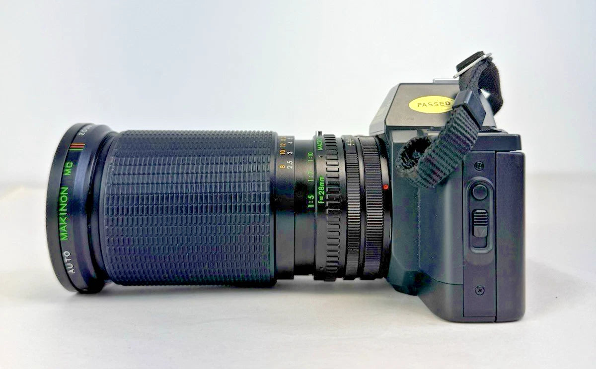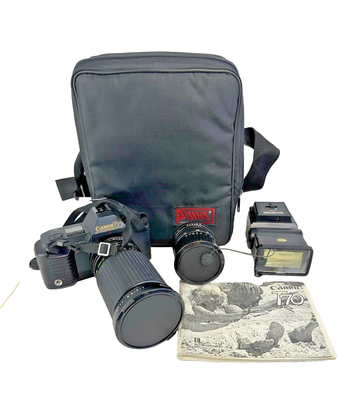 Canon T70 35mm SLR + FD 35-70mm & Makinon 28-135mm Lenses Flash Kit - UNTESTED