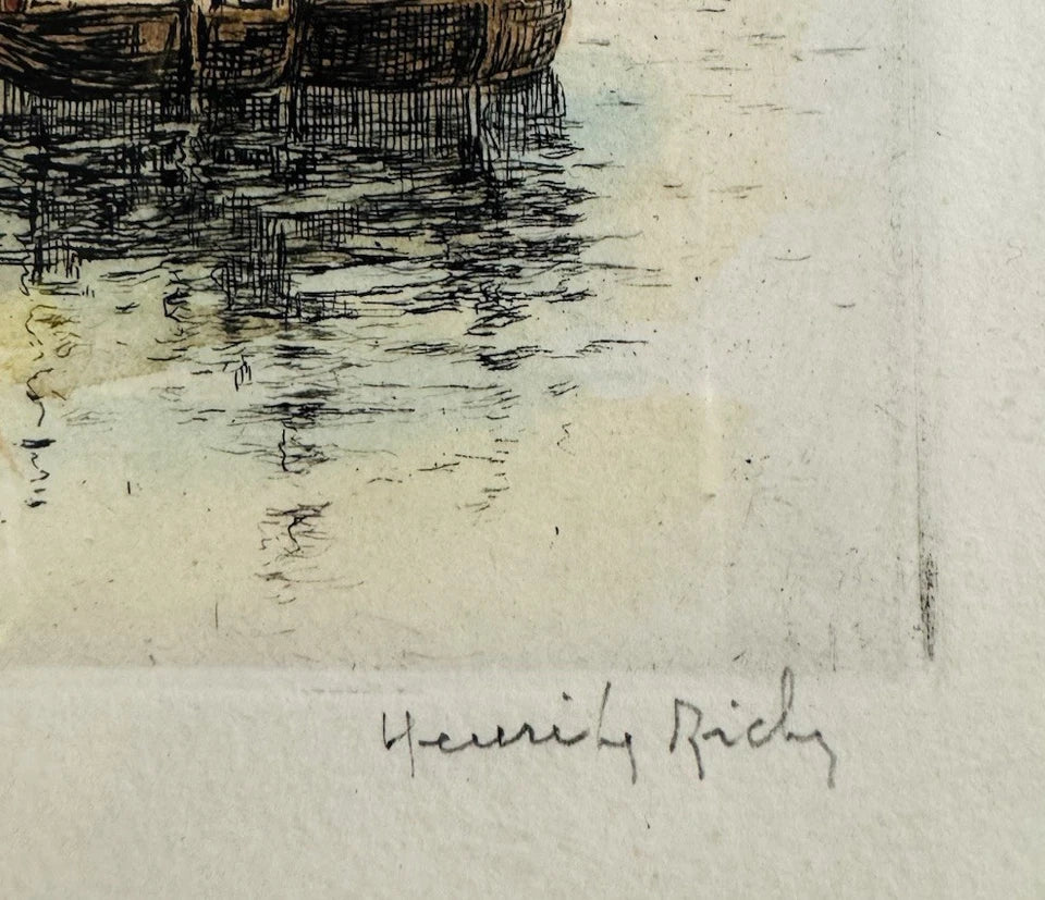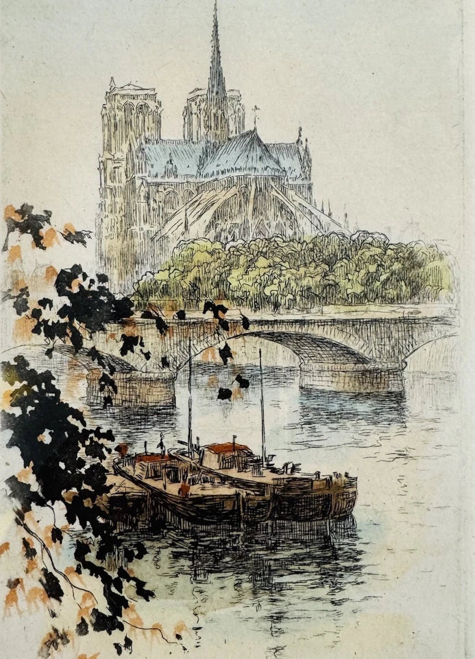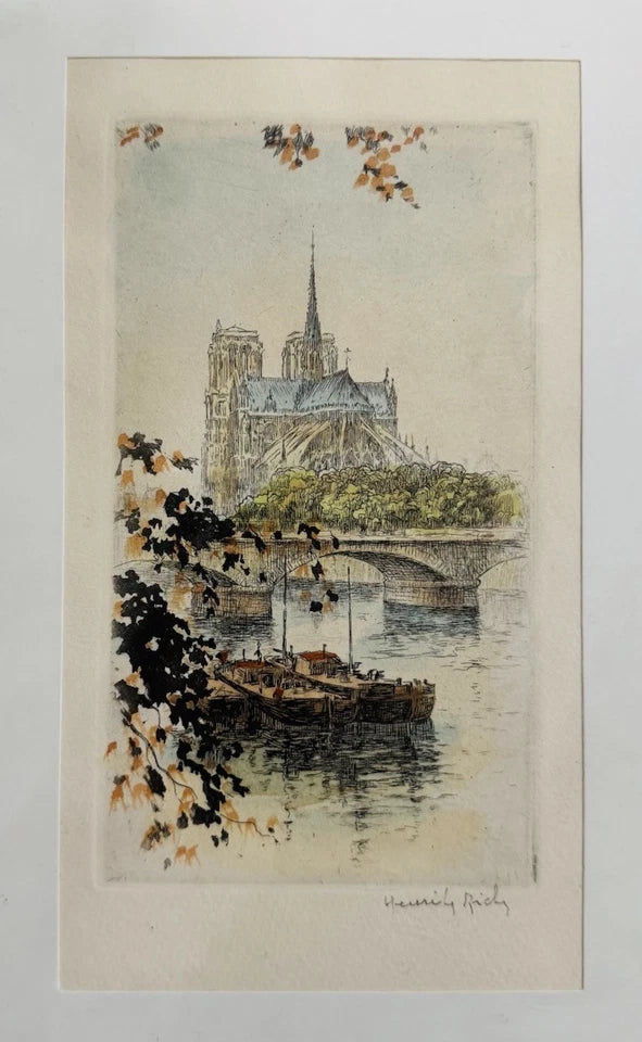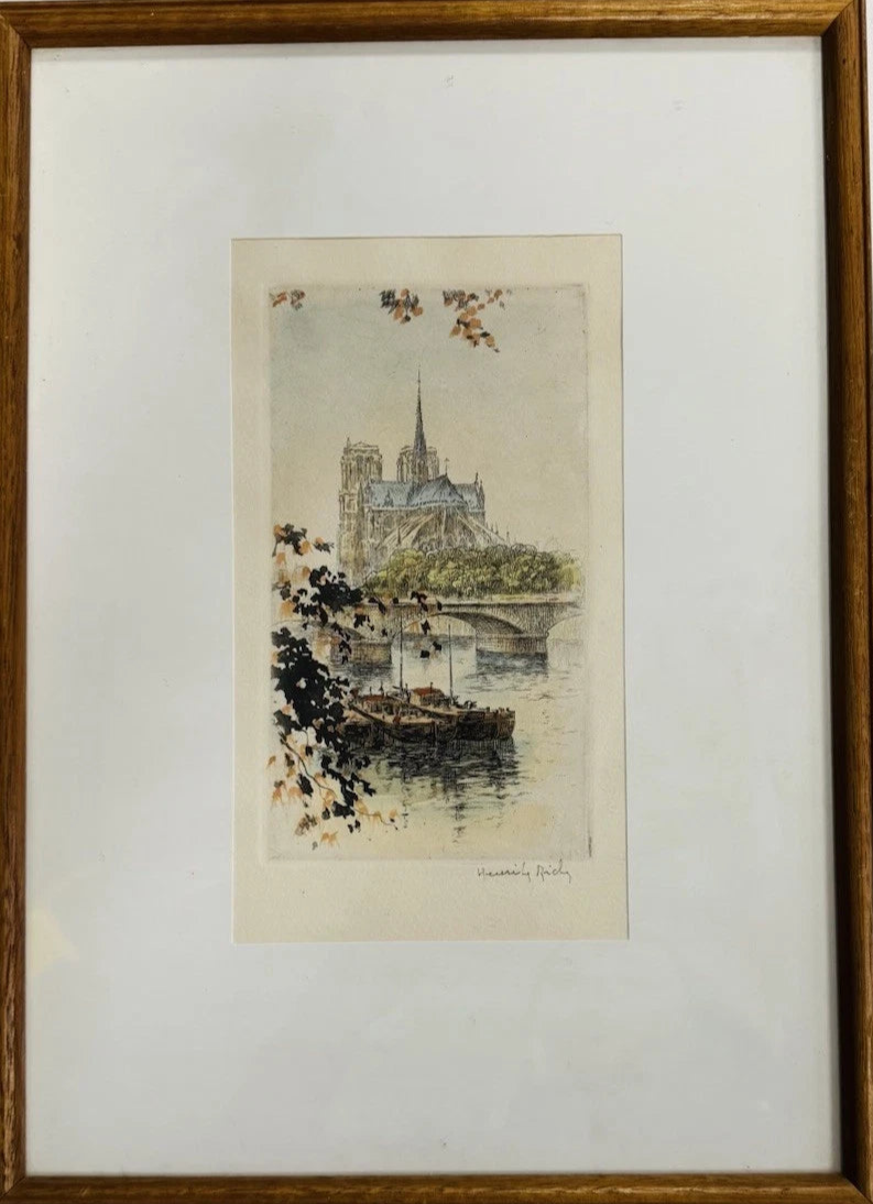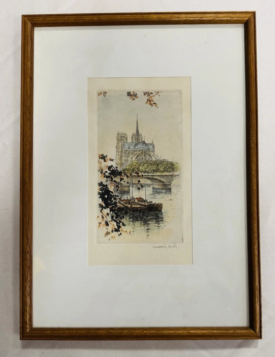 Hand Coloured Etching by Henri Le Riche ‘View Across Seine’ Paris, Signed