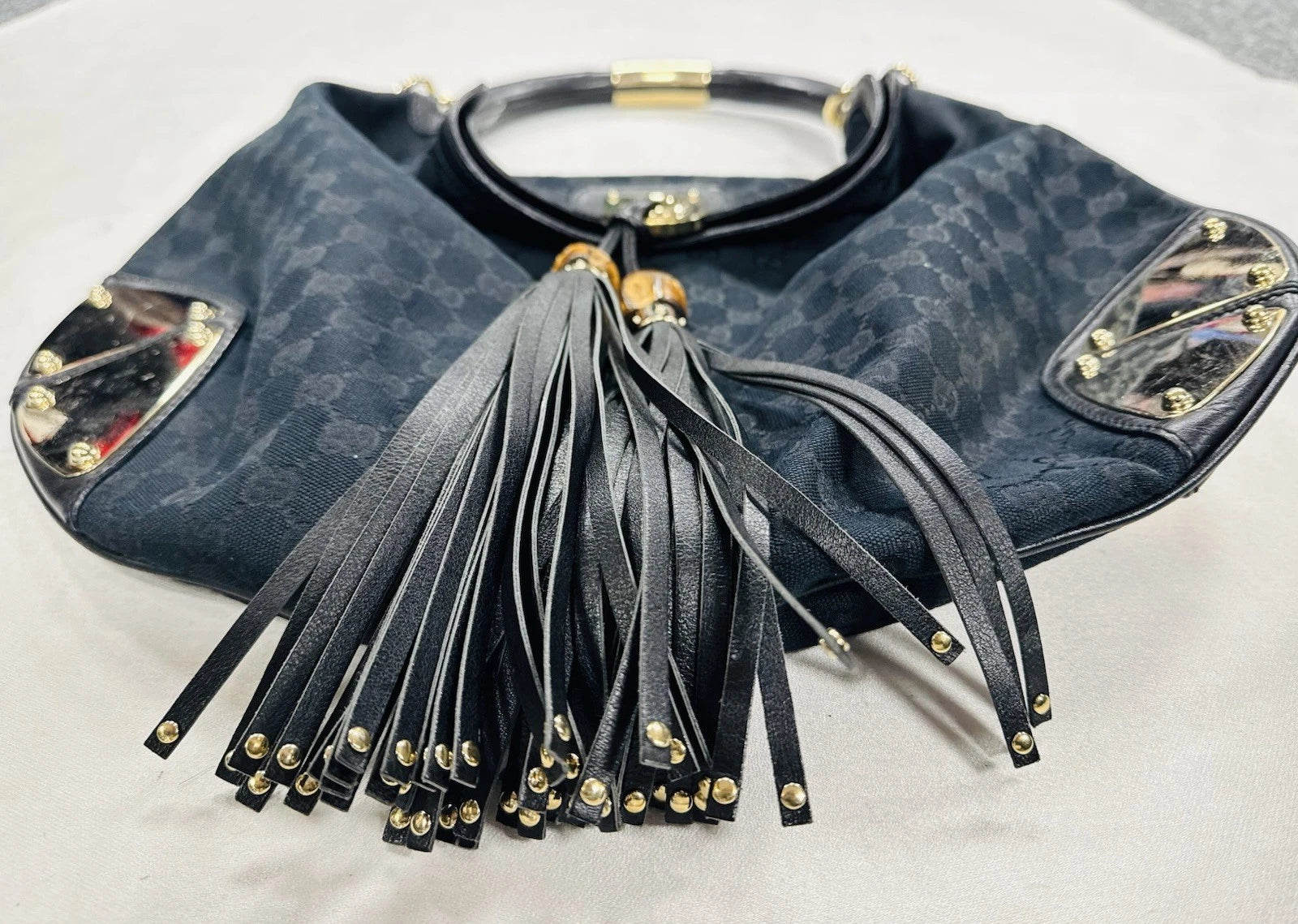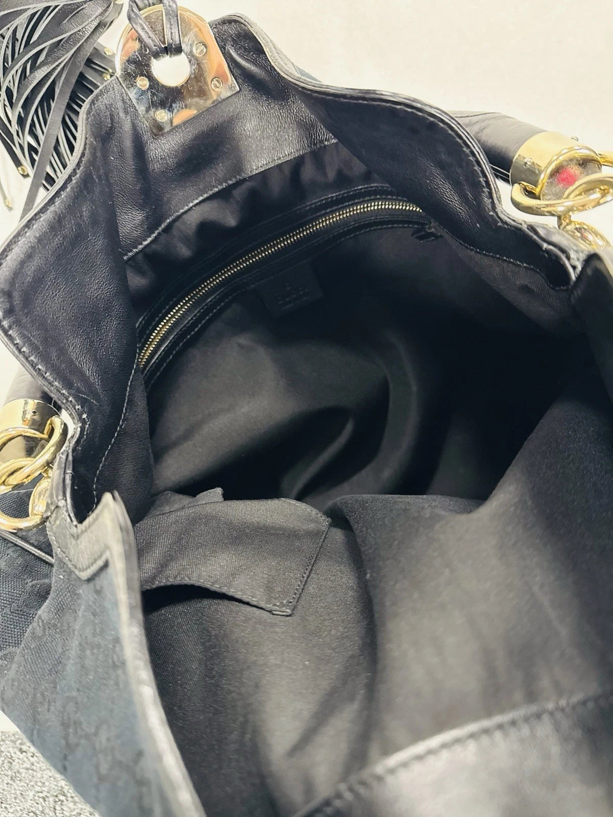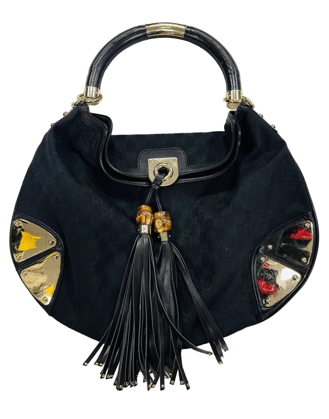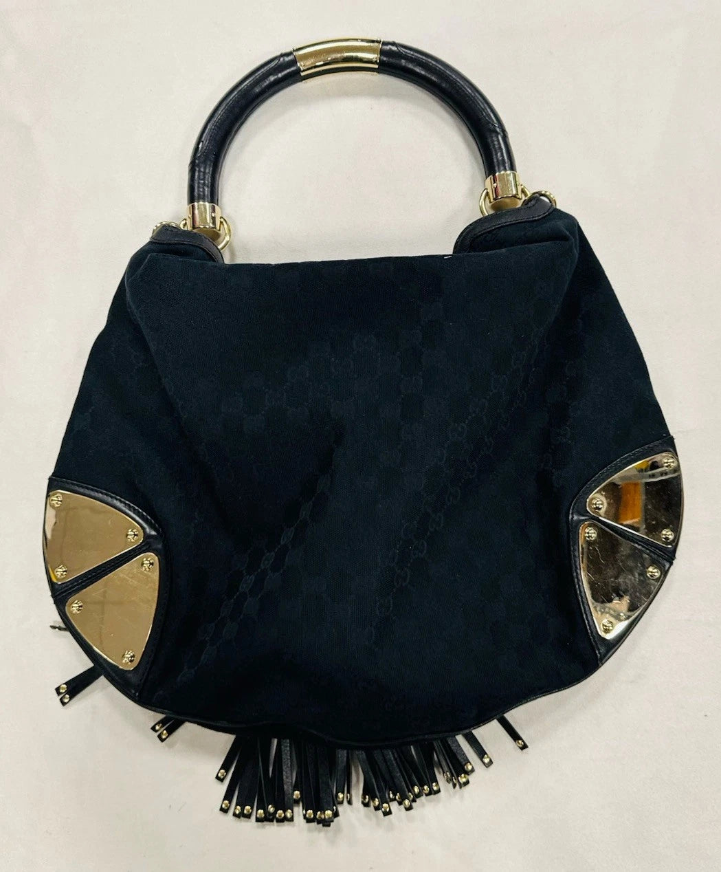 Gucci Black GG Monogram Canvas Medium Indy Tassel Hobo Top Handle Bag