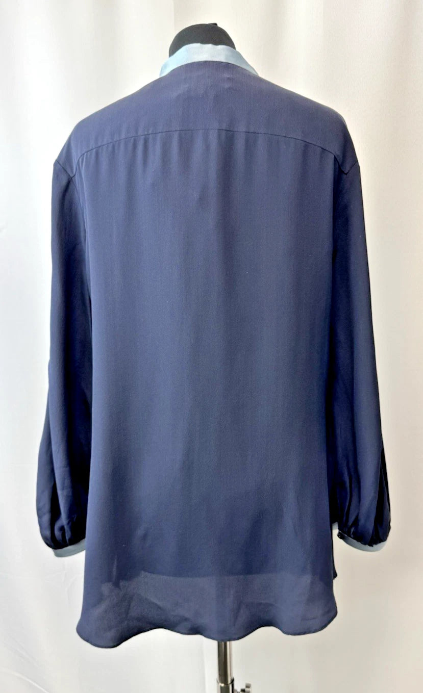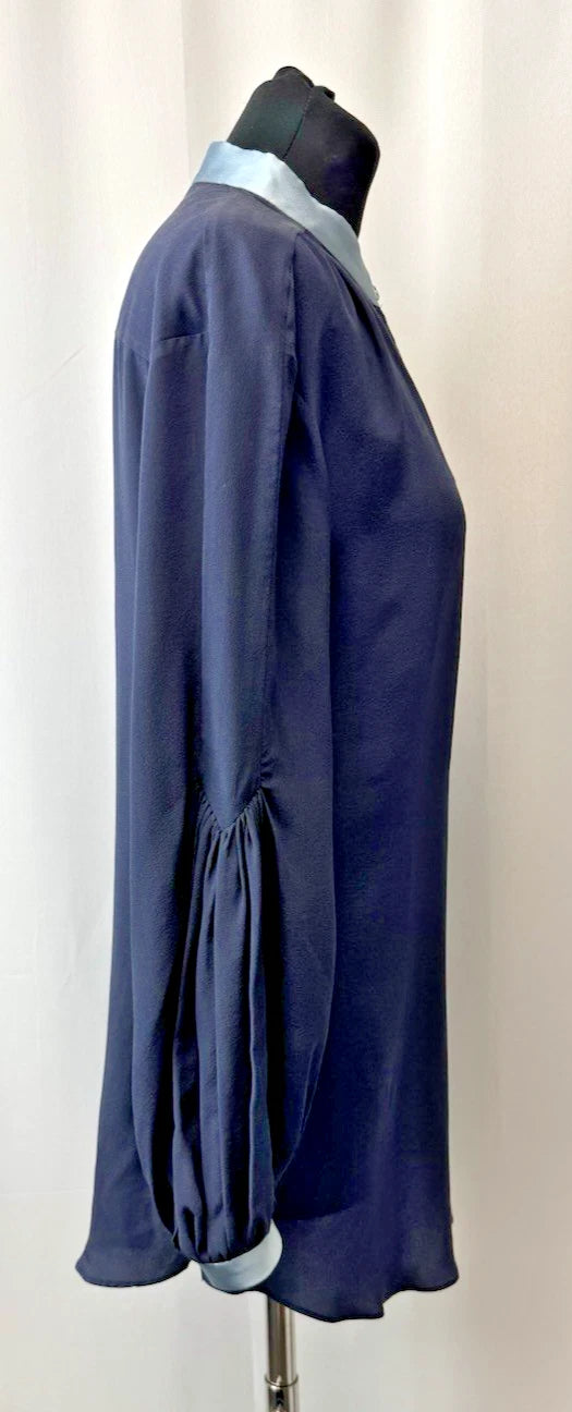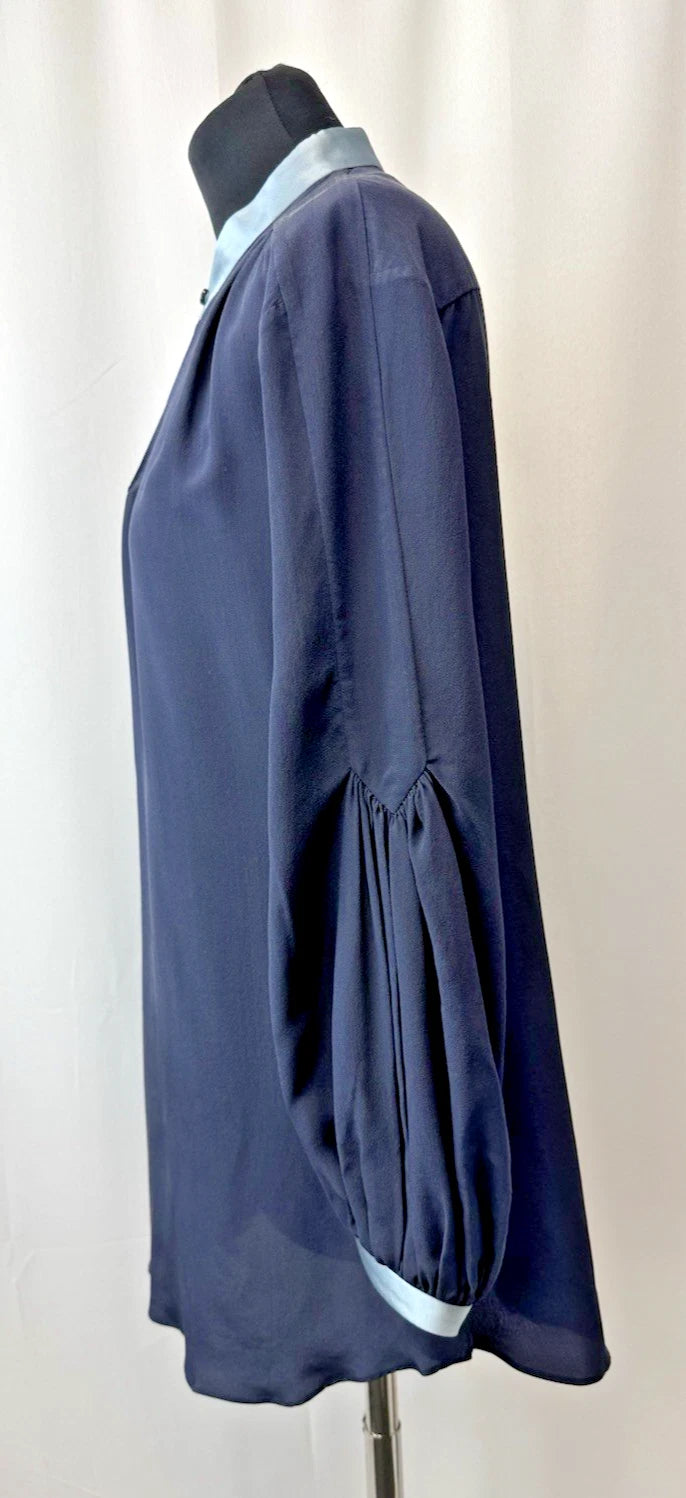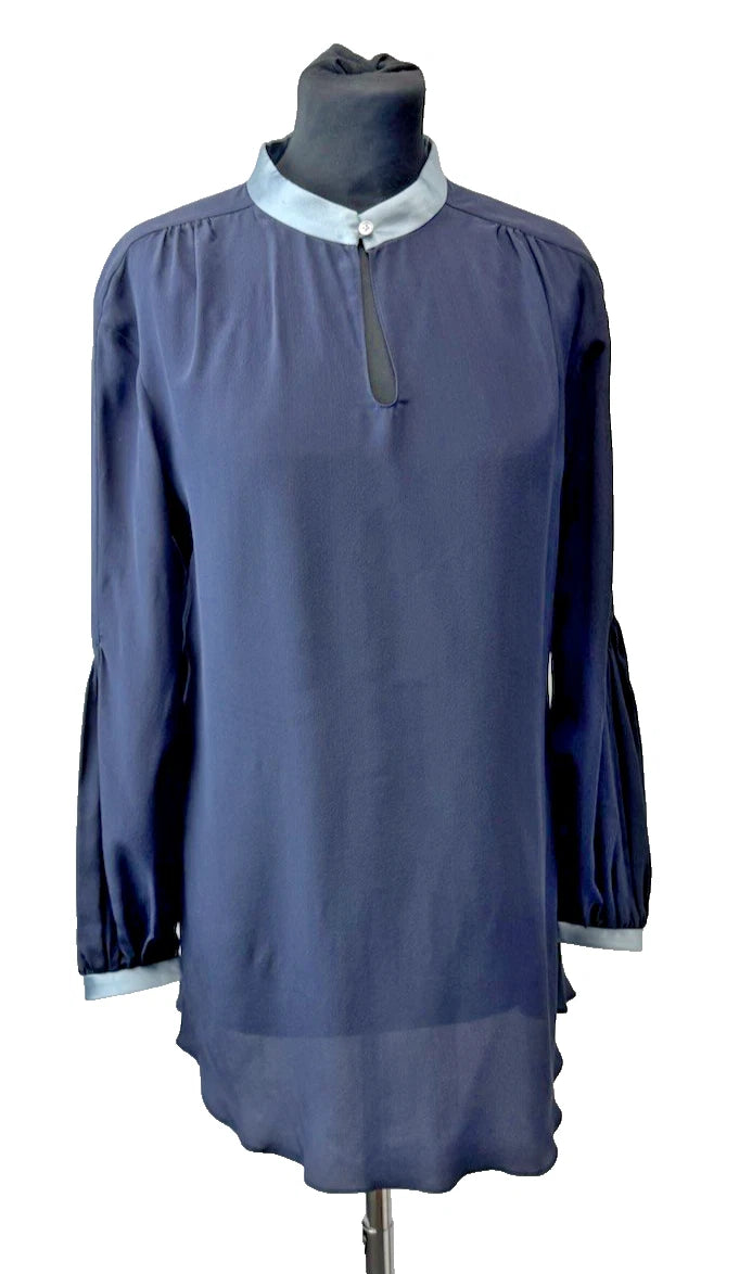 DePloy London Women's Stand Collar Long Sleeve Silk Blouse Navy Size 10 - NEW