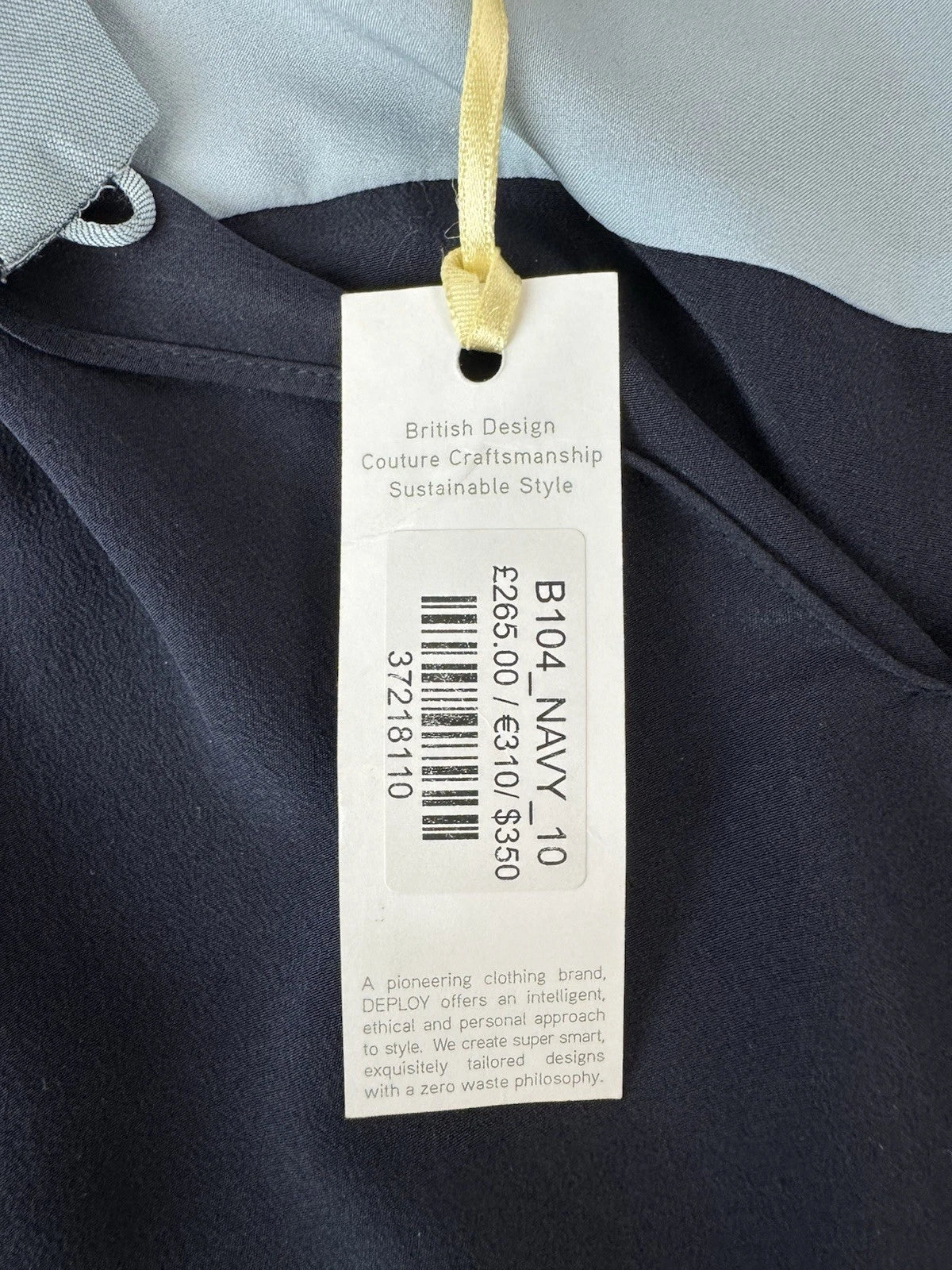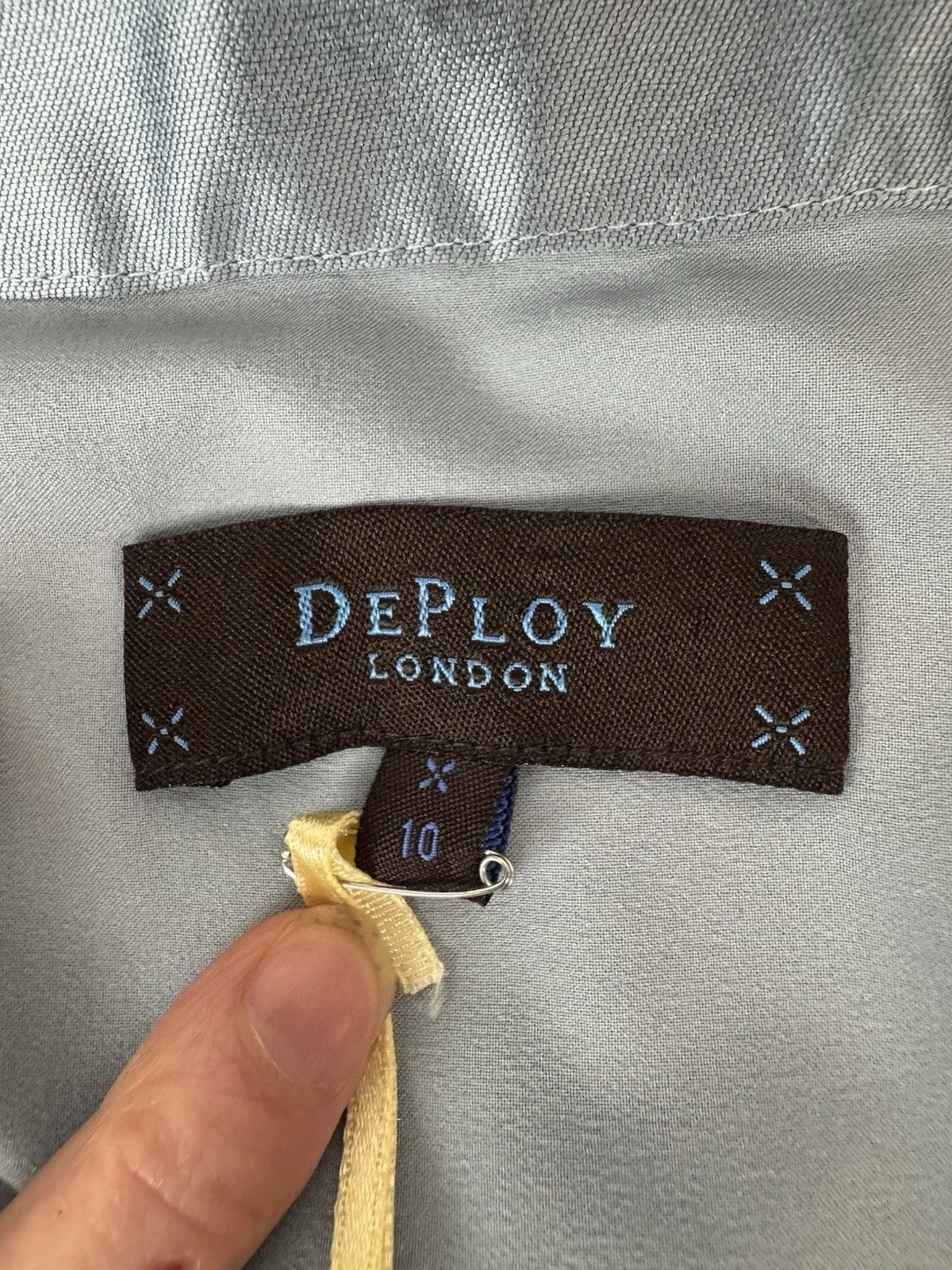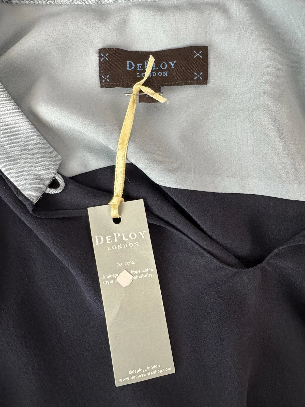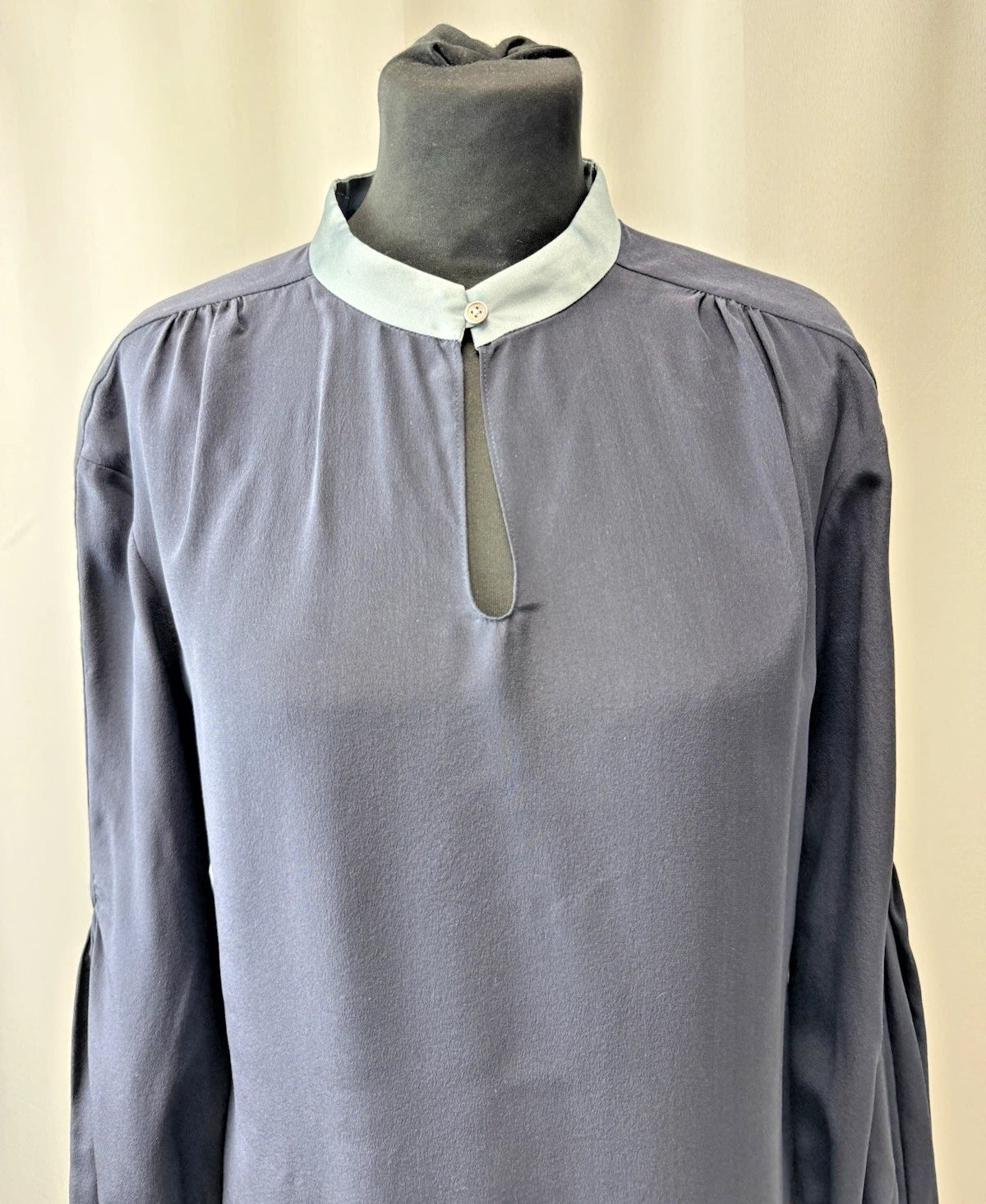DePloy London Women's Stand Collar Long Sleeve Silk Blouse Navy Size 10 - NEW