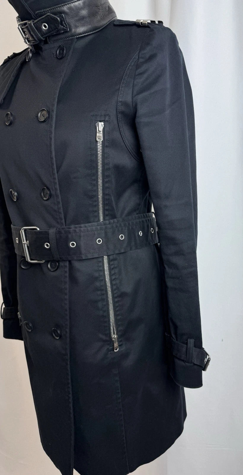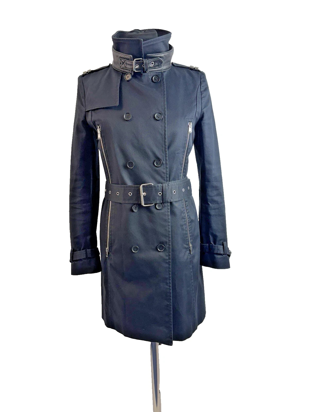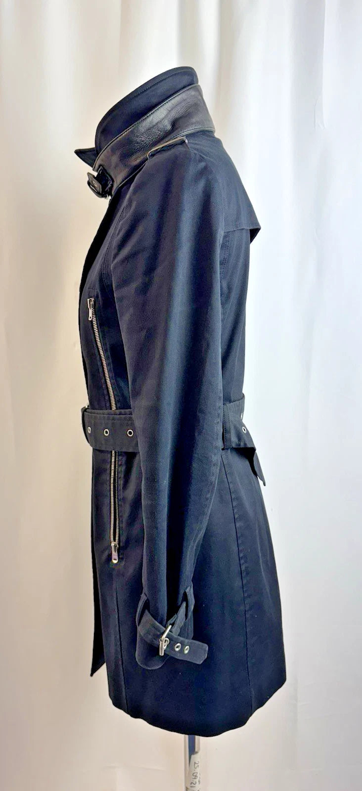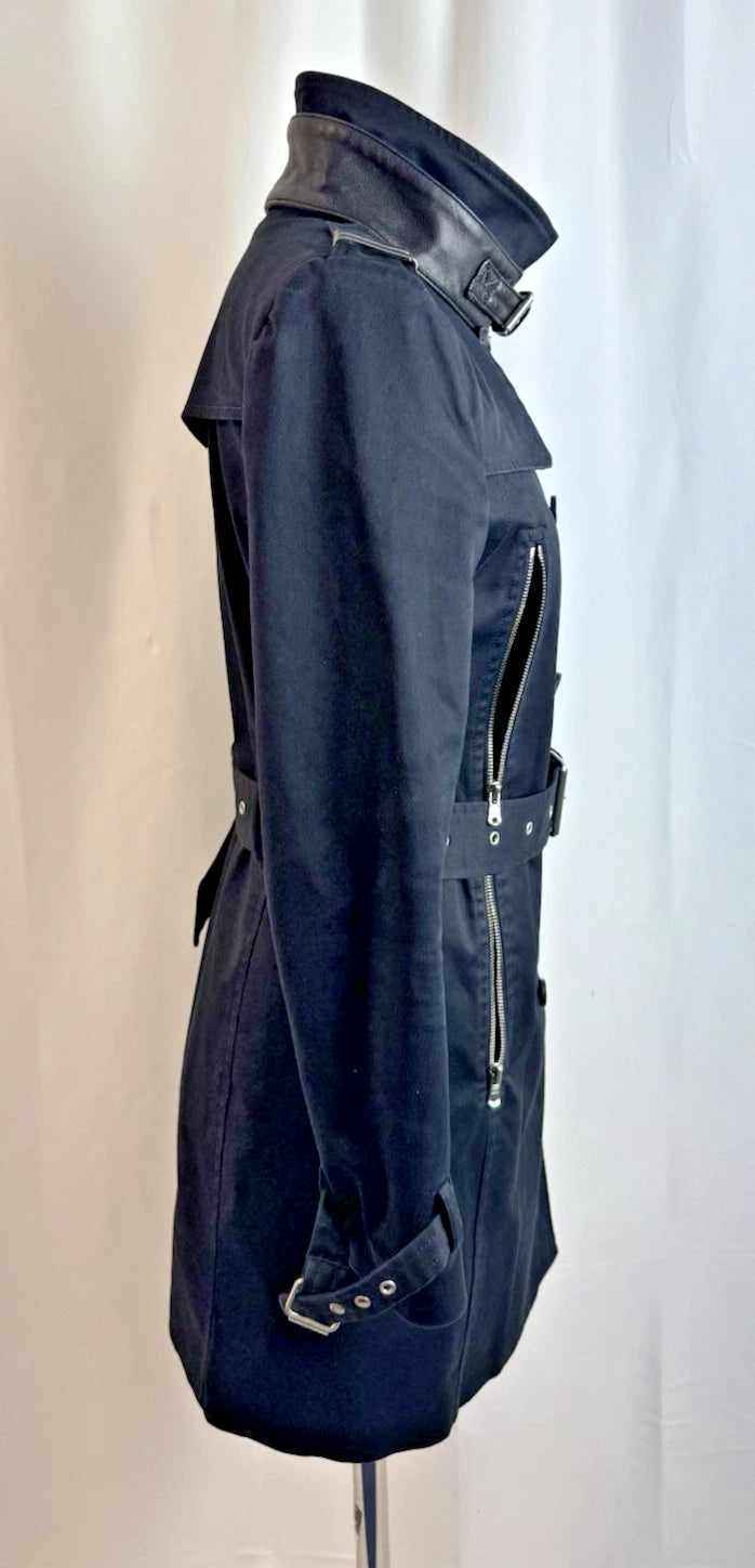 The Kooples Women’s Black Biker Style Belted Trench Coat Zippers Epaulettes Sz 8