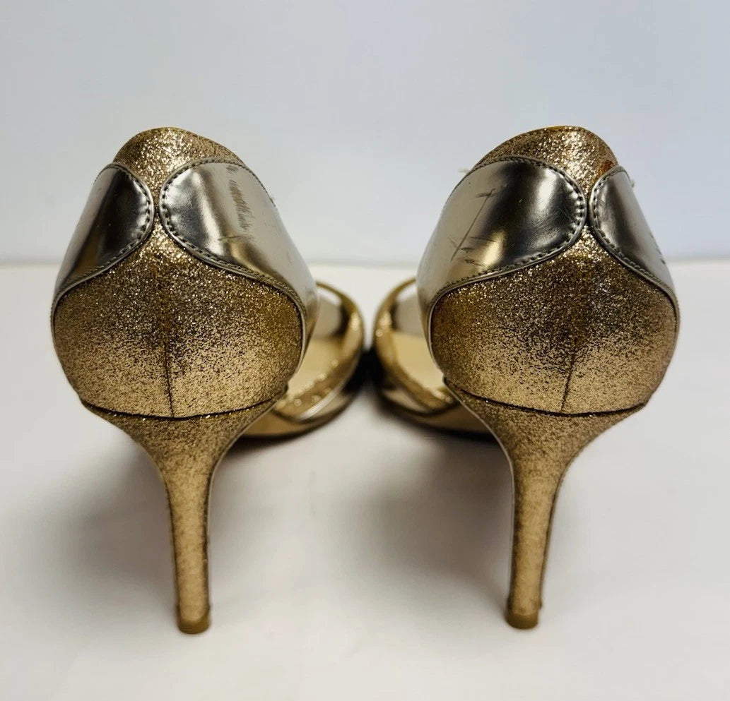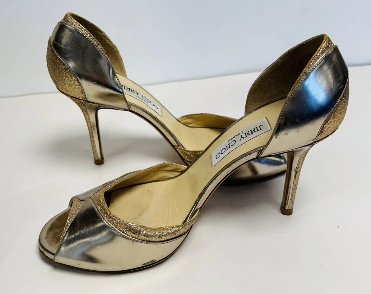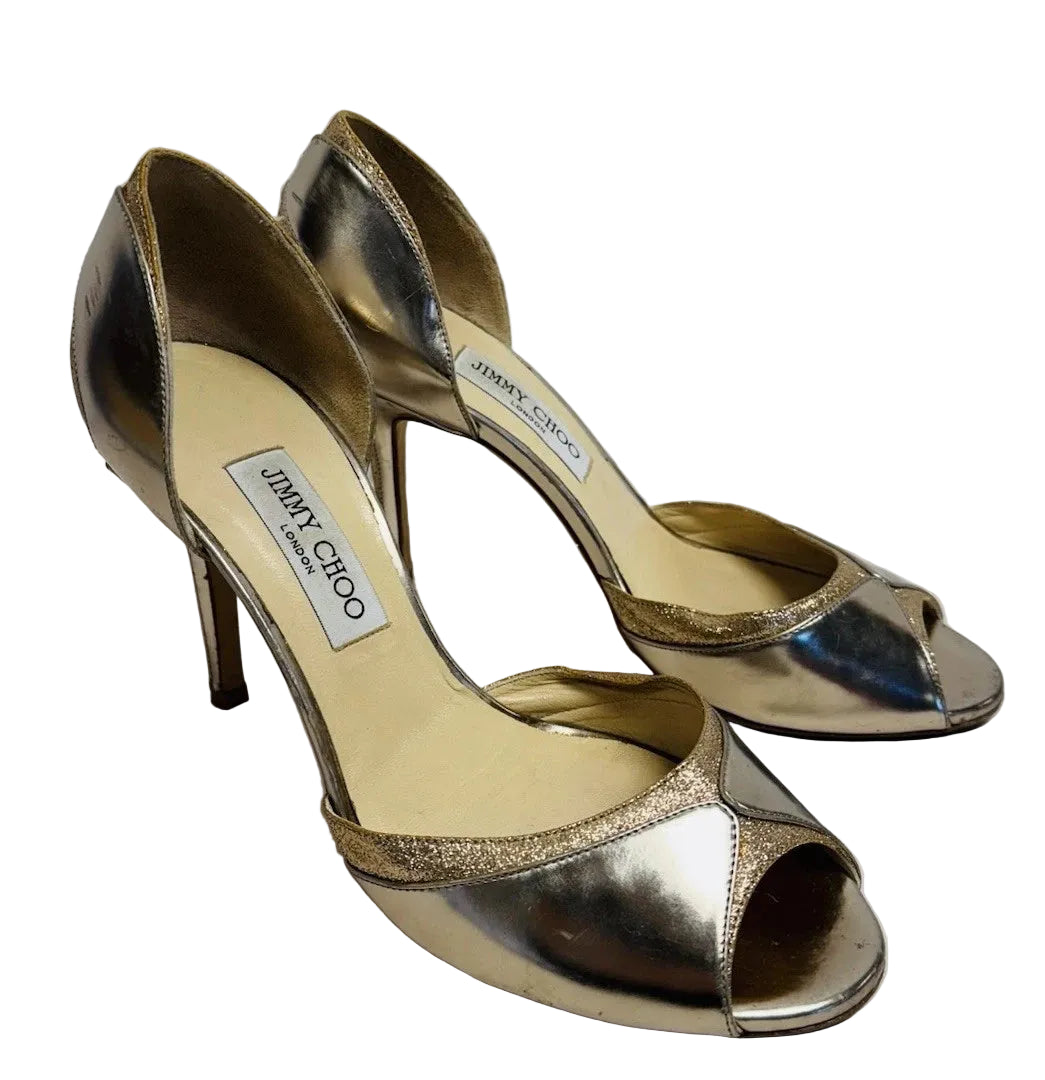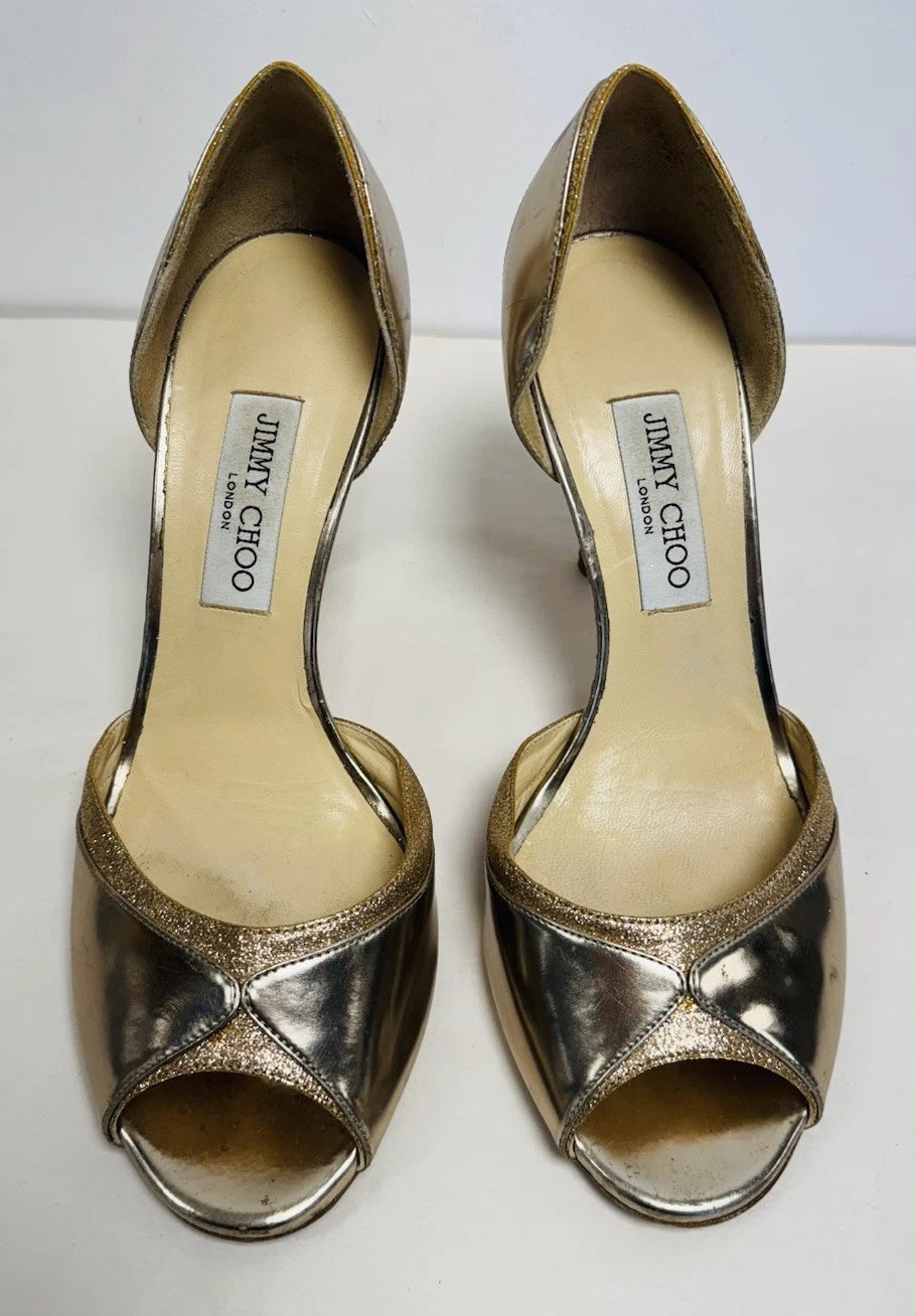 Jimmy Choo Patent Leather Gold Glitter Peep Toe Women’s Heels Size UK 7.5
