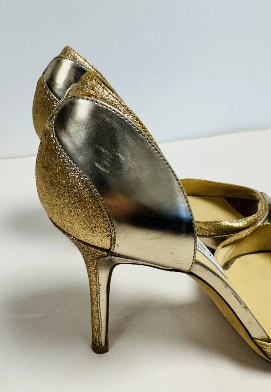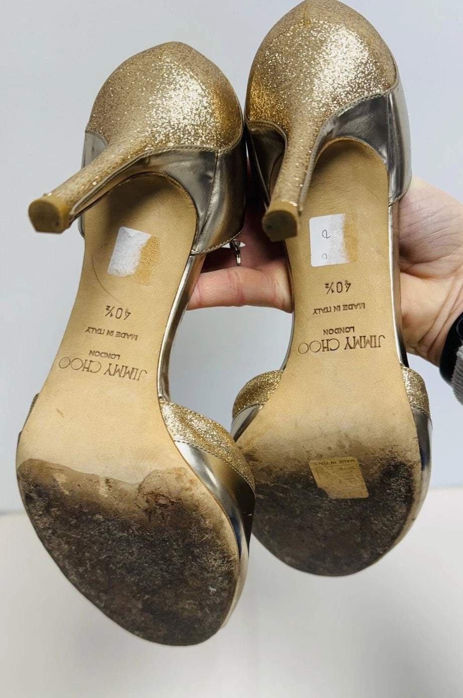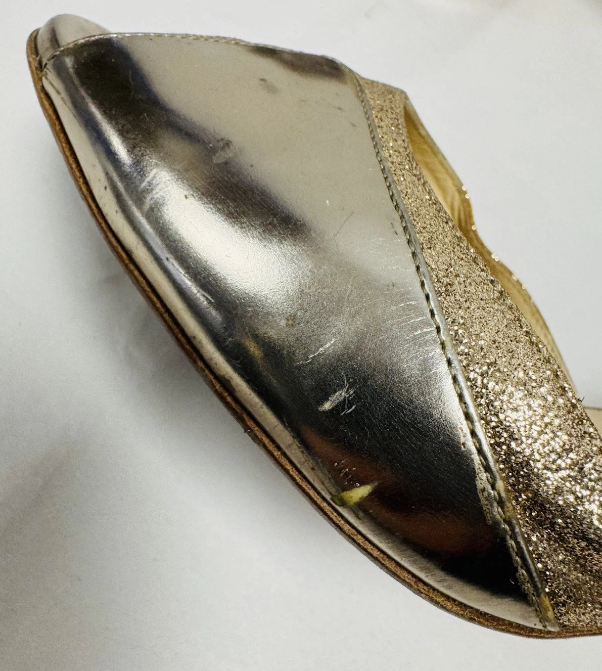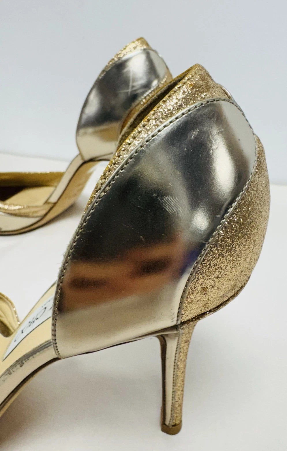 Jimmy Choo Patent Leather Gold Glitter Peep Toe Women’s Heels Size UK 7.5